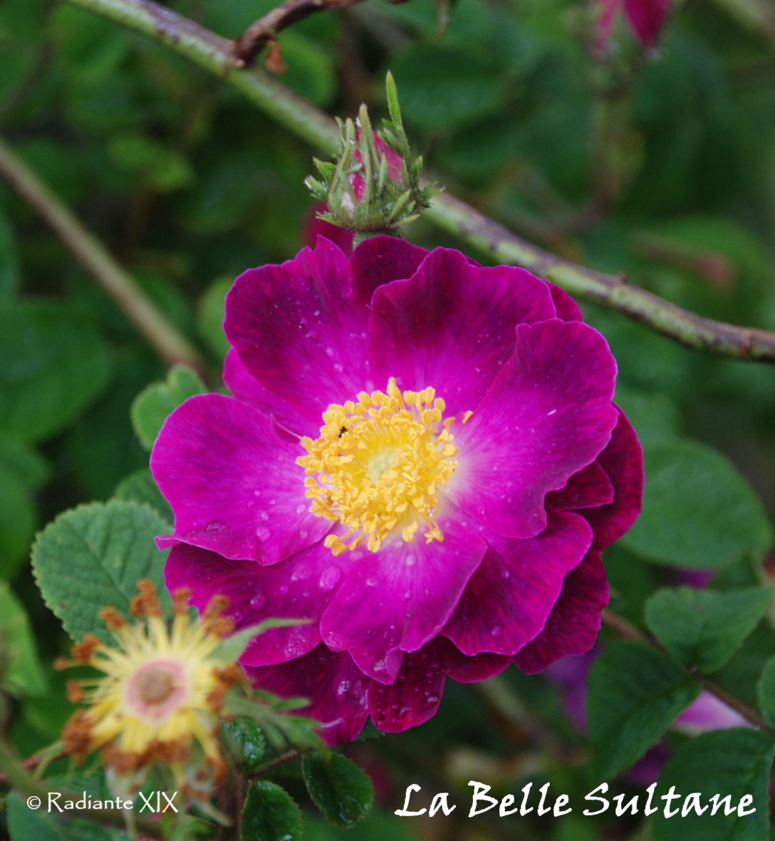 Grey green foliage with red bristly stems. High disease resistance, again typical of the Centifolia group, Most, if not all, of the once blooming roses have excellent disease resistance. They predate the introduction of ‘Rosa foetida’ into rose breeding, a rose that brought the much sought yellow to modern roses but with the penalty of susceptibility to fungal infection. Being a small rose pruning can be restricted to the removal of an old stem or two immediately after blooming in the summer, or you can leave her alone. Should you grow her on her own roots she will spread by throwing up suckers. I have seen her grown as a low hedge as well.
